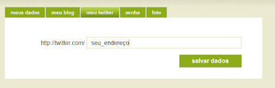 Para cadastrar seu twitter é fácil: bastar se logar no site e editar seu perfil. Aparecerá uma nova aba chamada “meu twitter”. Digite seu endereço lá, salve e pronto!